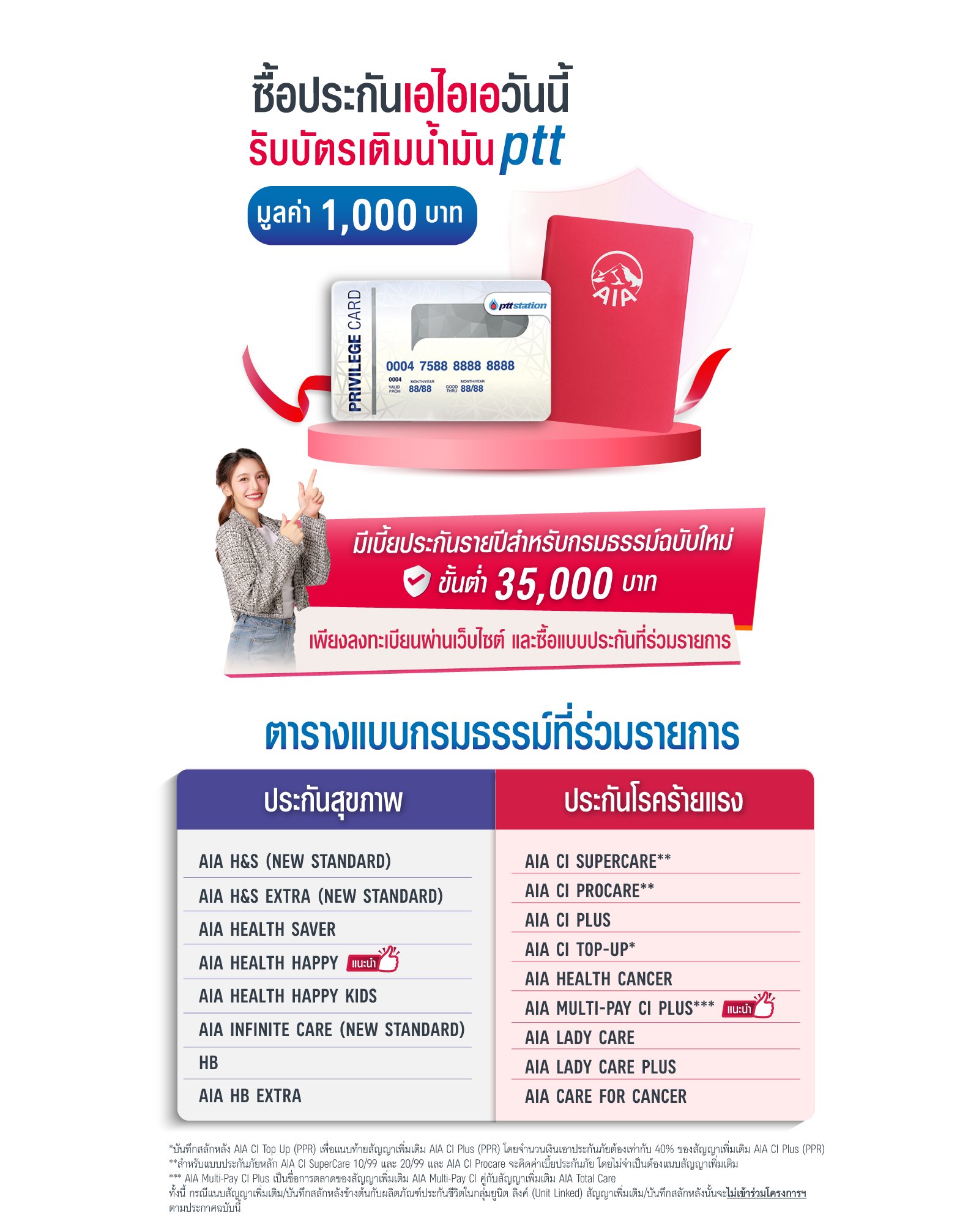 * บันทึกสลักหลัง AIA CI Top Up (PPR) เพื่อแนบกับสัญญาเพิ่มเติม AIA CI Plus (PPR) โดยจำนวนเงินเอาประกันภัยต้องเท่ากับ 40% ของสัญญาเพิ่มเติม AIA CI Plus (PPR)